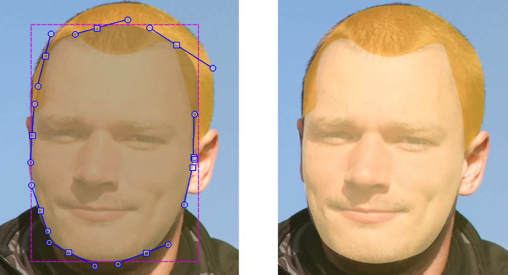 Das heißt: Violett wird immer über schwarz, schwarz immer über blau und blau immer über grün dargestellt usw. Das erleichtert das Kartieren ungemein. In meinem Beispiel habe ich das Gesicht mit 403: Raues offenes Gebiet gezeichnet. Für die Haare benutzte ich 401: Offenes Gebiet, welches über der 403 angezeigt wird, sodass man nicht mehr sieht, dass die Gesicht-Fläche oben in die Haar-Fläche ragt: