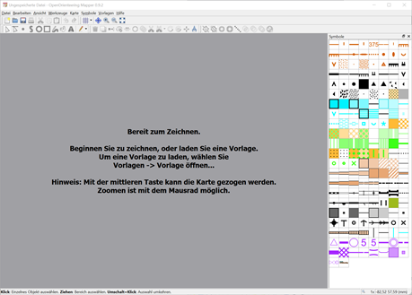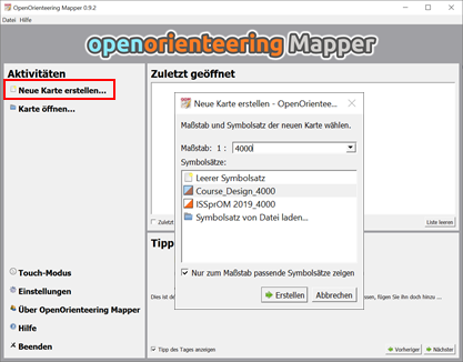 Wir wollen mit einer Sprintkarte anfangen, setze darum als Maßstab 1:4000. Als Symbolsatz wähle den neuen Sprint-Standard ISSprOM 2019_4000. Nach Klick auf „Erstellen“ ist man direkt im Hauptprogramm: