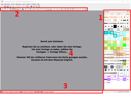 1. Der Symbolsatz mit den bekannten OL-Kartensymbolen. Schwebt man mit der Maus über einem Symbol, wird die Nummer sowie eine Kurzbeschreibung angezeigt. Eine ausführlichere Beschreibung erscheint, wenn man nach dem Anklicken F1 drückt. Noch ausführlicher und auf deutsch werden die Symbole hier erklärt.